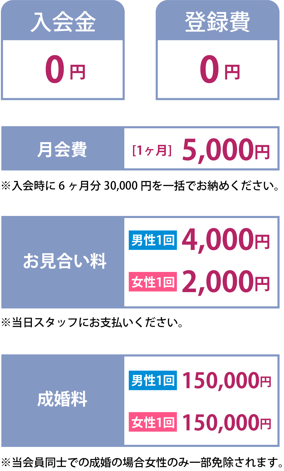 私たちは株式会社のように営利を目的としておらず、仲人さんの集まりによって運営されている任意の団体です。費用は仲人さん達の協力により賄っているため、高額な入会金や月会費を必要としていないからです。